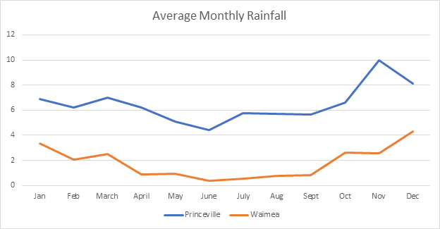 So you can see that the temperatures are always quite pleasant—in the 70’s and low 80’s.  So what about the rain?  The diagram below shows the monthly average rainfall (in inches) for the cities of Waimea and Princeville.  The different weather sites seemed to vary on the absolute values but the magnitude and trends were always consistent.