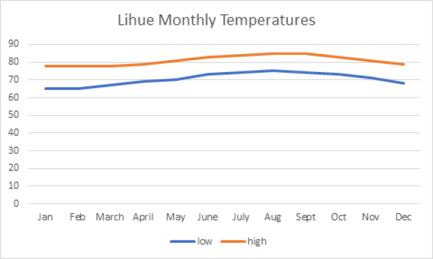 The next factor in determining when to go should be the weather. Below shows the high and low temperatures (in degrees Fahrenheit) for Lihue. Other cities’ temperature may vary slightly, but not by much. Shown are the monthly average highs and lows.